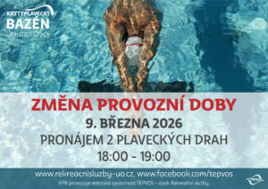 Upozorňujeme návštěvníky na změnu v provozní době. Dne 9. 3. 2026 budou od 18:00 do 19:00 pronajaté 2 plavecké dráhy.Děkujeme za pochopení.