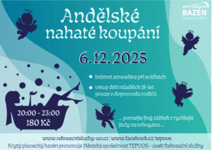 Listopadové Nahaté koupání mělo opět velký úspěch. A už se nám množí dotazy, kdy bude další. A my říkáme BRZY! Už 6. 12. 2025 proběhne ANDĚLSKÉ NAHATÉ KOUPÁNÍ v Krytém plaveckém bazéně.