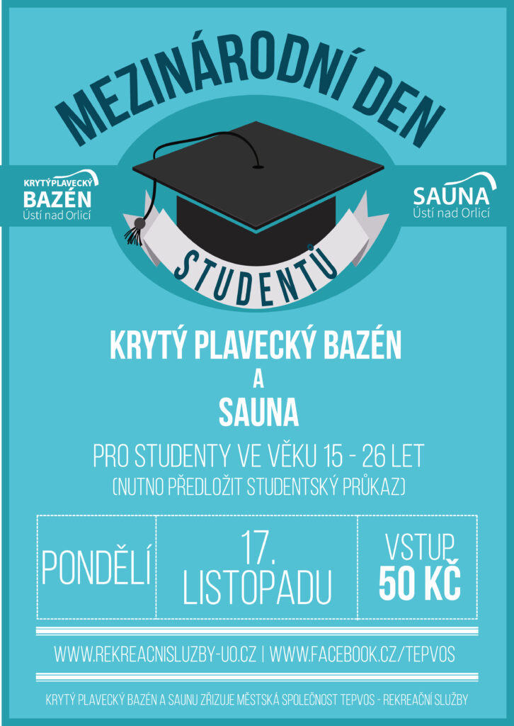 I letos s vámi oslavíme 📆 17. listopad – Mezinárodní den studentů 👩‍🎓, a to vstupem do Krytého plaveckého bazénu 🏊‍♂️ i Sauny 💆‍♂️ za symbolických 50 Kč 🪙 Akce platí pro 👩‍🎓 studenty ve věku 15 – 26 let.