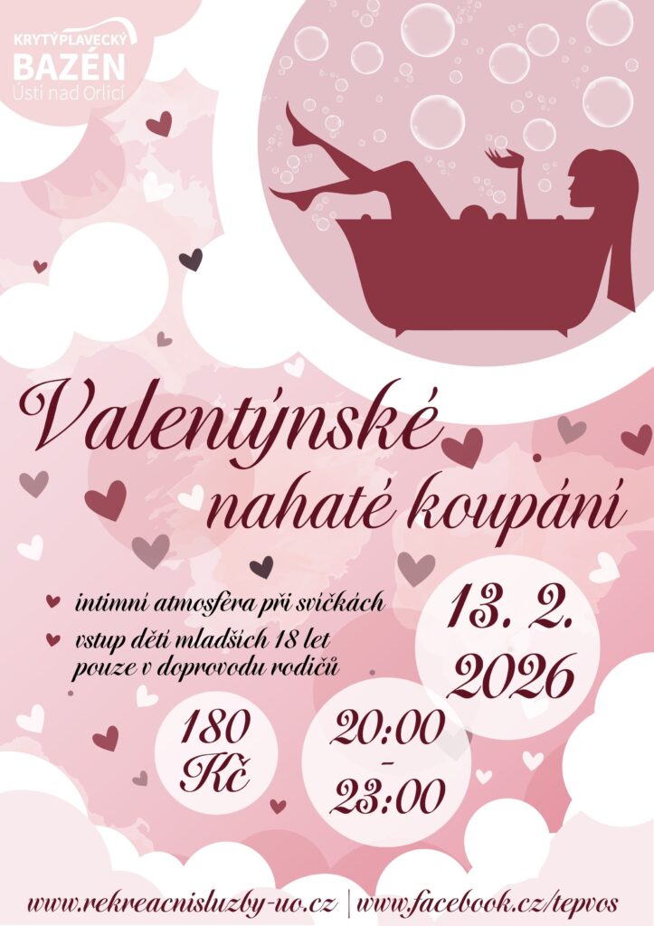 Hledáte originální a romantický plán na svátek zamilovaných? Přijďte si užít Valentýnské nahaté koupání v Krytém plaveckém bazénu v Ústí nad Orlicí!
